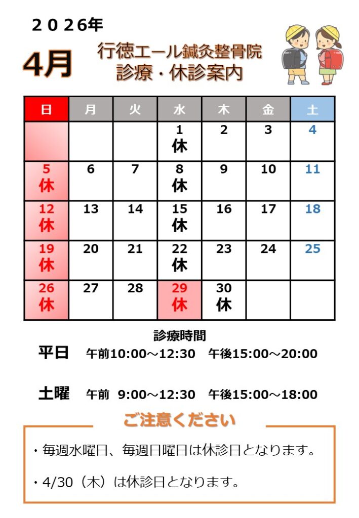 行徳エール鍼灸整骨院 4月 診療休診日情報