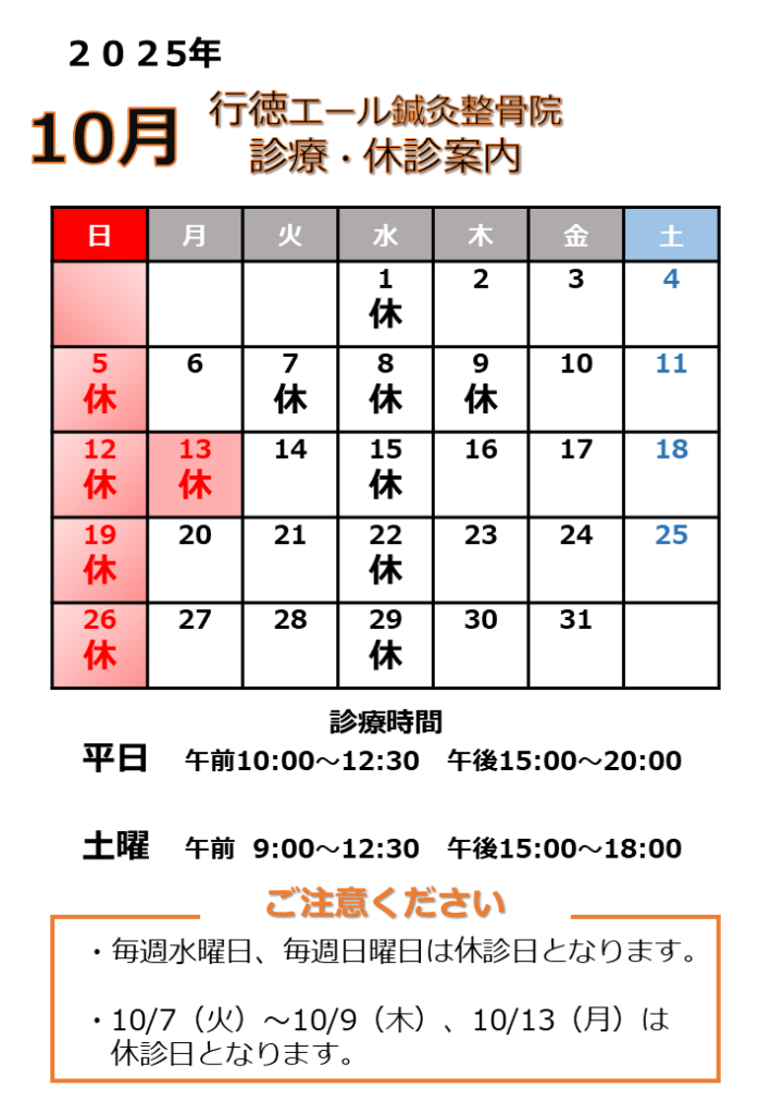 行徳エール鍼灸整骨院 10月診療休診日情報